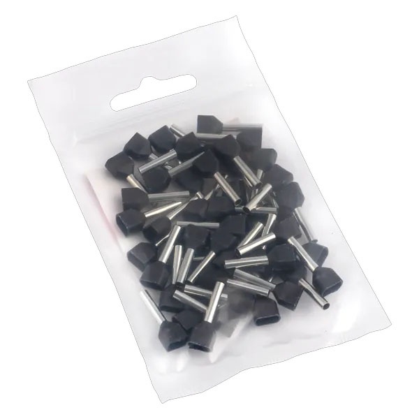 Двойные втулочные наконечники НШвИ2 разработаны специально для опрессовки и полностью заменяют необходимость облуживания многожильных медных проводов (например, ПВ-3, ПВС и других) при монтаже электрооборудования. Они состоят из медной луженой трубки с развальцованным концом для удобства ввода провода и полиамидной изолирующей манжеты.