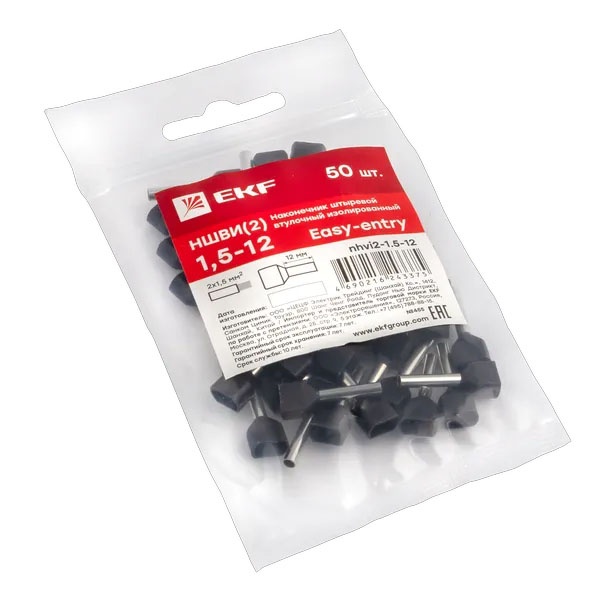 Наконечник штыревой втулочный изолированный двойной EKF НШВИ2 1,5-12 мм2 (50шт) nhvi2-1.5-12