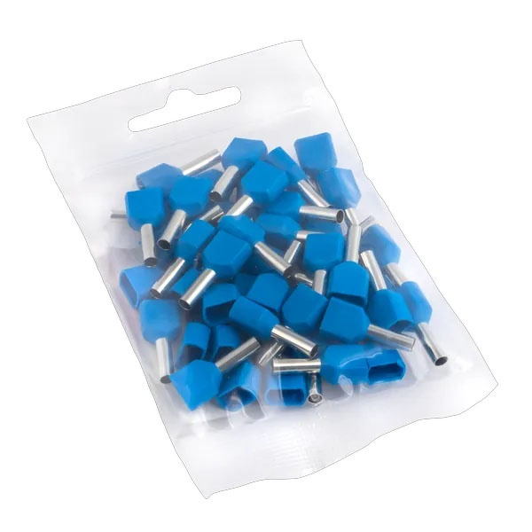 Двойные втулочные наконечники НШвИ2 разработаны специально для опрессовки и полностью заменяют необходимость облуживания многожильных медных проводов (например, ПВ-3, ПВС и других) при монтаже электрооборудования. Они состоят из медной луженой трубки с развальцованным концом для удобства ввода провода и полиамидной изолирующей манжеты.