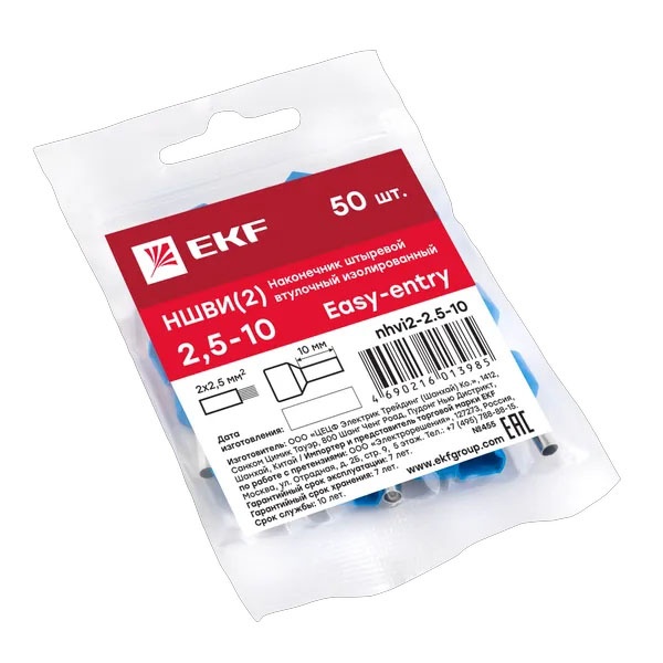 Двойной изолированный штыревой втулочный обжимной наконечник НШвИ2 2.5мм2 (50шт.) EKF nhvi2-2.5-10
