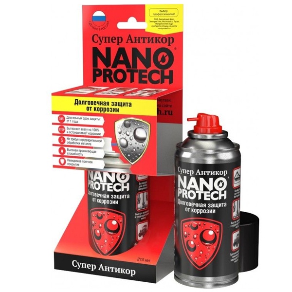 Единственное в мире средство, на 100% вытесняющее влагу. Мощная антикоррозийная защита от любых агрессивных воздействий реально надолго. Прочное невидимое нанопокрытие надёжно защитит от коррозии внешние и внутренние поверхности всех видов транспорта, промышленного, сельскохозяйственного и строительного оборудования минимум на 1 год. Многократно продлевает срок эксплуатации устройств и оборудования. Применяется для внутренних поверхностей кузова, днища, порогов, арок, болтов, петель, скрытых полостей салона и багажника, подкапотного пространства всех видов транспорта,ворот, гаража, труб, вентелей, лебёдок и т.п. Рекомендуется для консервации оборудования и техники в межсезонье.
