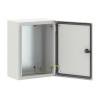 Боковые панели выгнуты из цельного листа. Задняя панель крепится к боковым панелям с использованием специального профиля, обеспечивающего пыле- и влагонепроницаемость. Наружная и внутренняя поверхности шкафа покрыты текстурированной эпоксидно-полиэфирной эмалью серого цвета RAL 7035. Благодаря своей прочности металлические шкафы идеально подходят для эксплуатации в помещениях, где они могут подвергаться внешним механическим воздействиям.