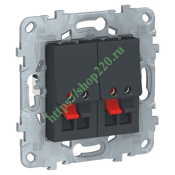 Качество и надежность данной аудиорозетки гарантируется известной компанией-производителем Шнайдер Электрик. Красивый дизайн фронтальной накладки делает ее заметной в общем интерьере помещения. На изделии ярко выделяются красный и черный цветовые фрагменты. Лицевая панель розетки имеет два уровня. Верхний слегка выступает над коннекторными модульными вводами, но этого вполне достаточно, чтобы разъемы были безопасности в рабочем положении в случае случайных скользящих механических воздействий на них.