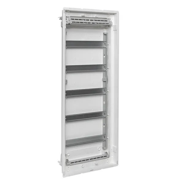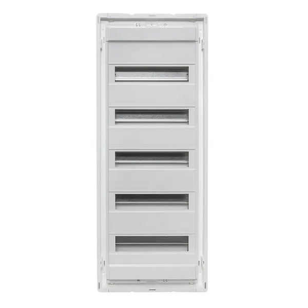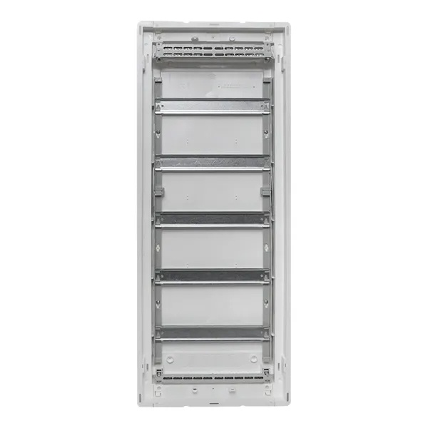 Изделие от компании-производителя EKF PROxima представляет собой основание силового щита из серии «Nova». Оно используется для сборки шкафов распределения электроэнергии. Основание применяется для скрытой установки и монтируется как в гипсокартон, так и в бетонные или кирпичные стены. Областью применения выступают многоквартирные жилые дома, частные домостроения и офисные помещения. Для финальной сборки корпуса дополнительно приобретается дверь необходимого размера и исполнения на выбор: металла или металла с перфорацией. Материалом изготовления основания является качественный пластик со степенью ударопрочности IK08. Цвет исполнения – белый. Оснащено din-рейками, на которые можно установить модульное оборудование в количестве 60 единиц+10 дополнительных в 5 рядов. Номинальное напряжение для встраиваемой аппаратуры составляет 230/400 Вольт, а нагрузка тока достигает 63 Ампер. Степень защиты составляет IP40, климатическое исполнение УХЛ3, температура окружающей среды находится в диапазоне от -25 до +60 градусов Цельсия. Данная модель имеет типоразмер 5 и следующие параметры: 798х305х87 мм. Глубина ниши должна иметь параметры: 802х313х90 мм. В комплект с основанием входят: шины 10+10+10+10 N и 30 PE, пластрон и 2 съемных фланца, 4 монтажные пластины, 4 комплекта монтажа для полых стен, 2 крепления пластрона, заглушка пластрона на 6 модулей, модульная наклейка и паспорт.