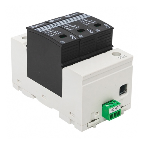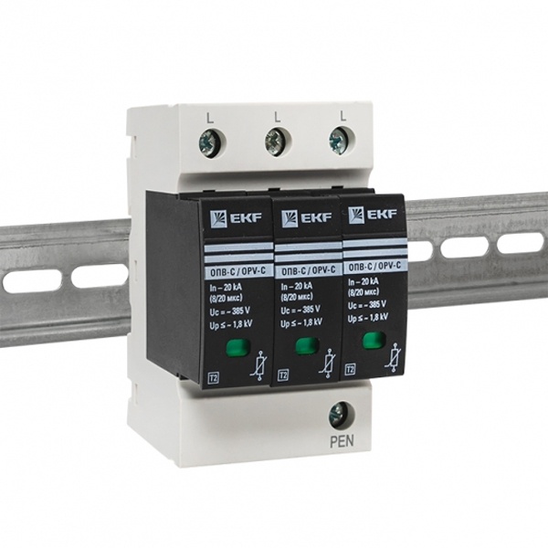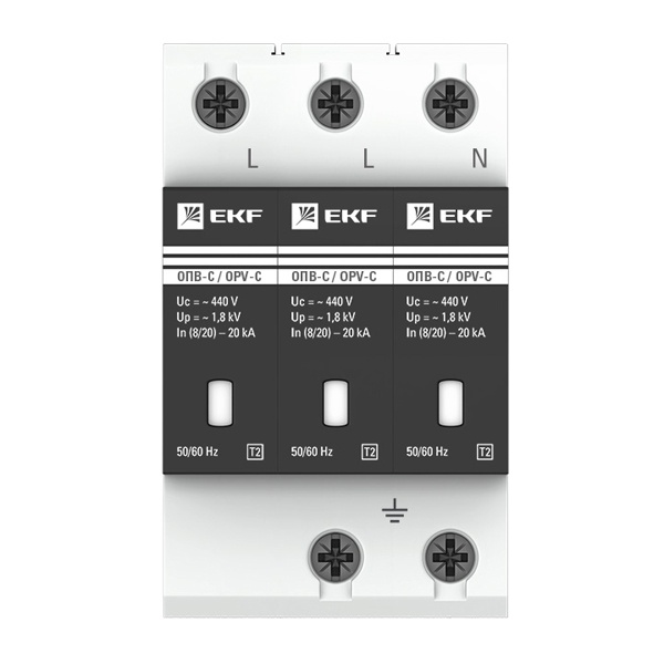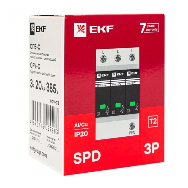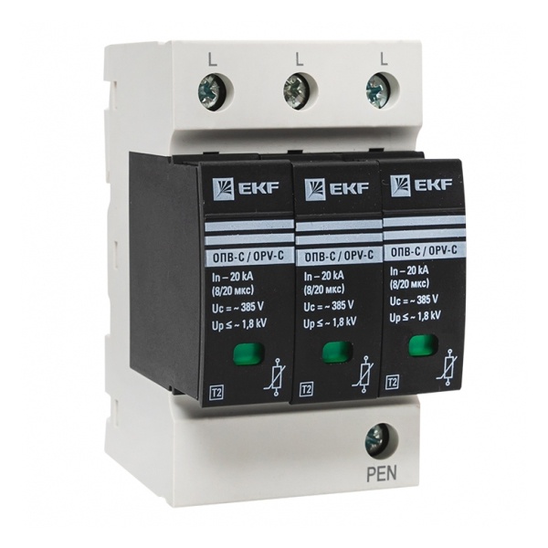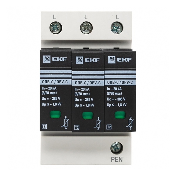 Трехполюсный разрядник торговой марки EKF представляет собой устройство защиты от импульсных перенапряжений класса C, которое обеспечивает защиту токораспределительной сети объекта от коммутационных помех. Данная модель категории типа Т2 служит вторым уровнем молниезащиты и оберегает электрические сети. Как правило, такой тип служит дополнительной защитой от импульсов, которые не были полностью нейтрализованы УЗИП 1 класса. Ограничитель ОПВ обладает шириной 3 модуля и крепится на DIN-рейку в распределительный щит. Номинальная амплитуда токов составляет 20 кАмпер, а напряжение электрической сети не должно превышать 400 Вольт частотой 50 Герц. Максимальный уровень напряжения защиты соответствует 1,8 кВольт. Разрядник оснащен съемными варисторными модулями, которые легко извлекаются. Они имеют индикатор износа, который сигнализирует о необходимости их замены. УЗИП без встроенной токовой защиты нуждается в установке автомата или предохранителя, обеспечивающего его гарантированное отключение. В комплект поставки входит колодка для подключения аварийного контакта. Максимальное сечение подключаемых проводников составляет 16 кв мм, при этом допускается коммутация алюминиевым и медным проводником. Масса ограничителя составляет 507 г.