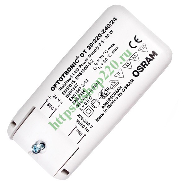 Блок питания Osram Optotronic для светодиодов мощностью 20 Ватт на 24 Вольт размерами 109х50х35 мм и степенью защиты IP20 OT 20/220-240/24