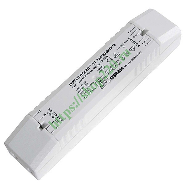 Блок питания Osram Optotronic для светодиодов мощностью 75 Ватт на 24 Вольт размерами 220х47х44 мм и степенью защиты IP20 OT 75/220-240/24