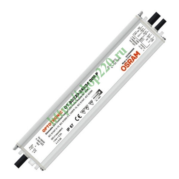 Блок питания Osram Optotronic для светодиодов мощностью 80 Ватт на 24 Вольт размерами 250х50х34 мм и степенью защиты IP67 4008321981677