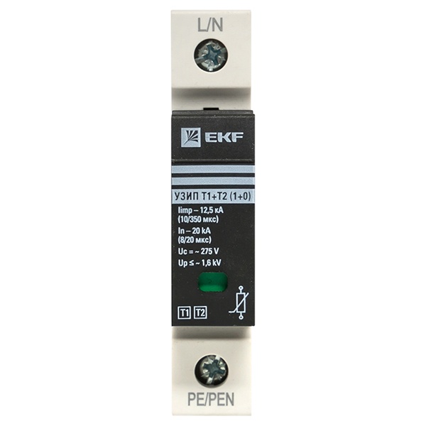 Устройство защиты от импульсных перенапряжений (УЗИП) компании EKF предназначено для ограничения переходных перенапряжений и отвода импульсов тока в сетях переменного тока частоты 50 Гц. Имеет 2 класса искрового разрядника Т1+Т2 для защиты от прямых ударов молнии в ВЛ или в систему внешней молниезащиты и срабатывает в качестве 2-ой ступени защиты при ударе молнии. Наличие клеммника для подключения аварийного контакта. Возможна коммутация алюминиевым и медным проводом. Сменный варисторный модуль защиты с индикацией выдерживает не менее 5 срабатываний. Для сетей TN-S схемы «1+1» («3+1») рекомендуются как максимально подходящие в те моменты, когда источник импульса не известен, а схемы «2+0» («4+0») используются когда импульс перенапряжения развивается от земли.