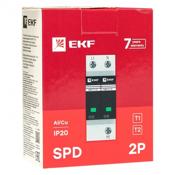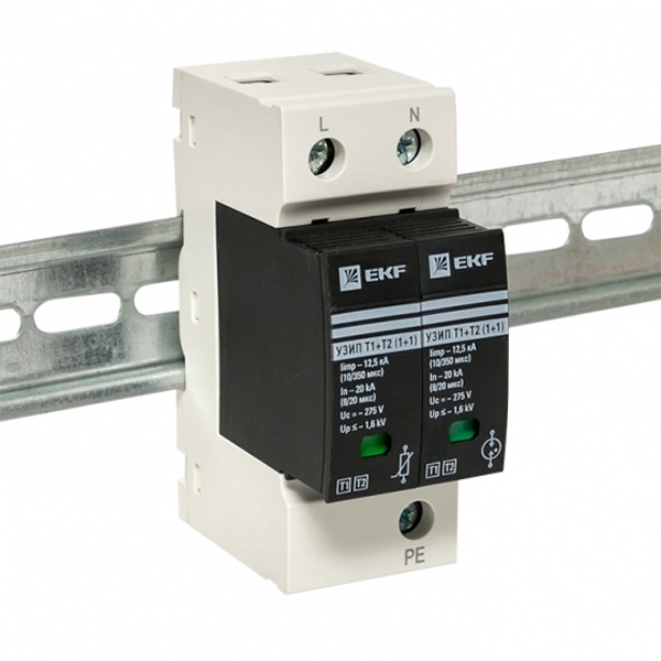 Устройство защиты от импульсных перенапряжений (УЗИП) компании EKF предназначено для ограничения переходных перенапряжений и отвода импульсов тока в сетях переменного тока частоты 50 Гц. Имеет 2 класса искрового разрядника Т1+Т2 для защиты от прямых ударов молнии в ВЛ или в систему внешней молниезащиты и срабатывает в качестве 2-ой ступени защиты при ударе молнии. Наличие клеммника для подключения аварийного контакта. Возможна коммутация алюминиевым и медным проводом. Сменный варисторный модуль защиты с индикацией выдерживает не менее 5 срабатываний. Для сетей TN-S схемы «1+1» («3+1») рекомендуются как максимально подходящие в те моменты, когда источник импульса не известен, а схемы «2+0» («4+0») используются когда импульс перенапряжения развивается от земли.