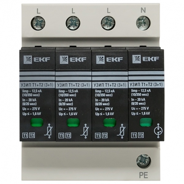 Устройство защиты от импульсных перенапряжений EKF Т1+Т2; Iimp-12,5kA In-20kA Uc-275В 3+1 4Р — комбинированное УЗИП (класс I+II), предназначенное для защиты электрической сети и подключенного оборудования от импульсных перенапряжений, возникающих из-за ударов молнии (прямых и наведенных), а также из-за коммутационных процессов в сети. Исполнение 3+1 и 4-полюсная схема обеспечивают комплексную защиту трехфазной сети с нейтралью, включая отдельную защиту цепи N-PE.