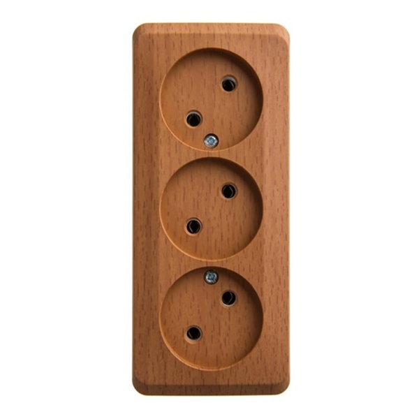 Розетка Schneider Electric ЭТЮД (бук, открытой установки) трёхместная, без шторок и заземления предназначена для применения в сетях до 250В, на ток до 16А. Трёхместная розетка позволяет подключить три устройства в одном месте. Она проста в установке и удобна в применении. Изделия цвета Бук обладают уникальным рисунком, напоминающим древесный сруб. Сделано в России.