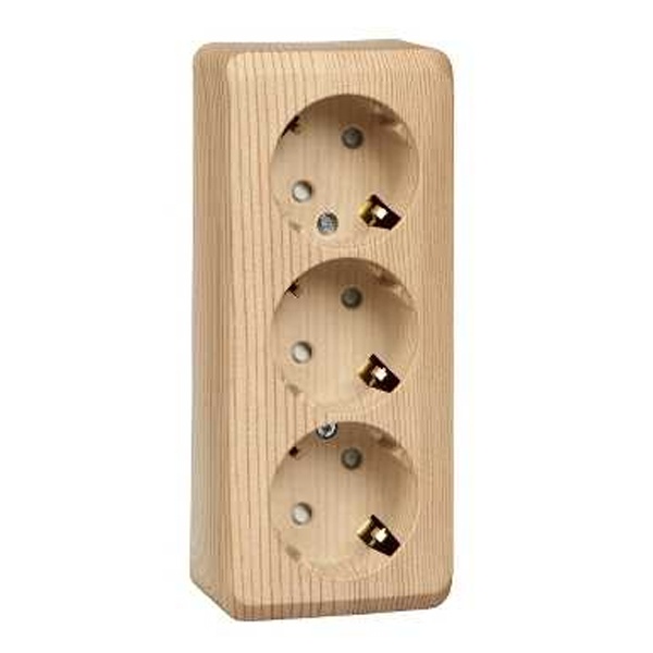 Корпус розетки выполнен из прочного и износостойкого пластика с текстурированной поверхностью под дерево, что придает ей декоративную привлекательность. Цвет "сосна" смотрится тепло и натурально, создавая уютную атмосферу в помещении. Устройство оснащено тремя гнездами с заземляющими контактами, что обеспечивает безопасное подключение современной бытовой техники, включая устройства с металлическим корпусом и повышенным уровнем потребления электроэнергии. Наличие заземления минимизирует риск поражения током и защищает оборудование от перепадов напряжения.