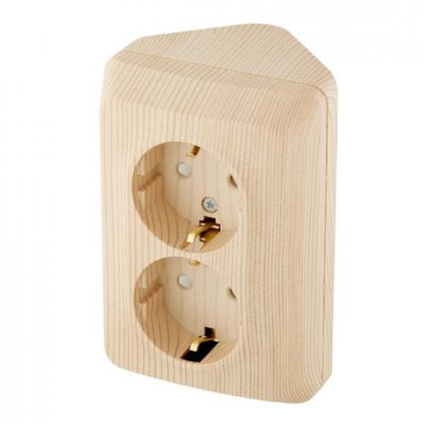 Розетка Schneider Electric ЭТЮД (сосна, открытой установки) двухместная угловая с заземлением, без шторок предназначена для применения в сетях до 250В, на ток до 16А. Ее конструкция позволяет установить розетку в угол помещения. Шторки и заземление обеспечивают дополнительную безопасность при косвенных прикосновениях. Изделия цвета Сосна обладают уникальным рисунком, напоминающим древесный сруб. Сделано в России.