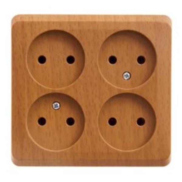 Розетка Schneider Electric ЭТЮД (бук, открытой установки) четырёхместная, без шторок и заземления предназначена для применения в сетях до 250В, на ток до 16А. Четырёхместная розетка позволяет подключить четыре устройства в одном месте. Она проста в установке и удобна в применении. Изделия цвета Бук обладают уникальным рисунком, напоминающим древесный сруб. Сделано в России.