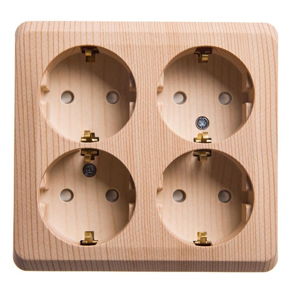 Розетка Schneider Electric ЭТЮД (сосна, открытой установки) четырёхместная с заземлением и шторками предназначена для применения в сетях до 250В, на ток до 16А. Четырёхместная розетка позволяет подключить четыре устройства в одном месте. Шторки и заземление обеспечивают дополнительную безопасность при косвенных прикосновениях. Изделия цвета Сосна обладают уникальным рисунком, напоминающим древесный сруб. Сделано в России.
