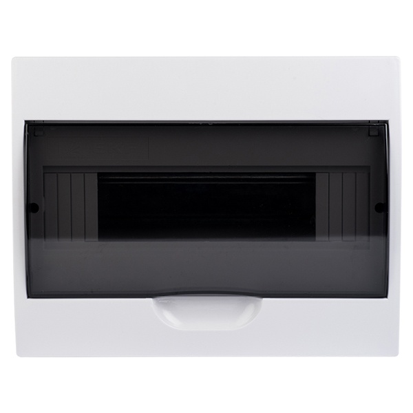 Распределительный щит ЩРН от известной компании EKF представляет собой компактную конструкцию настенной установки, служащую оболочкой для сборки различного модульного оборудования, устройств управления, таймеров и УЗО. Сфера применения данного бокса разнообразна: от жилых и офисных помещений до производственных цехов, подвалов и промышленных секторов. Он состоит из каркаса и двери, материалом изготовления которых служит прочный ABS-пластик, обеспечивающий надежную степень защиты IP41. Дверца имеет прозрачный затемненный внешний вид и обеспечивает наглядность за работой встроенной аппаратуры. Она открывается вертикально вверх и позволяет размещать бокс на стене независимо от положения соседних стен. Внутреннее пространство оснащено DIN-рейкой, 2-мя шинами N/PE с 5 отверстиями для подключения нулевого и заземляющего проводника. Данная модель рассчитана на установку 12 модулей.