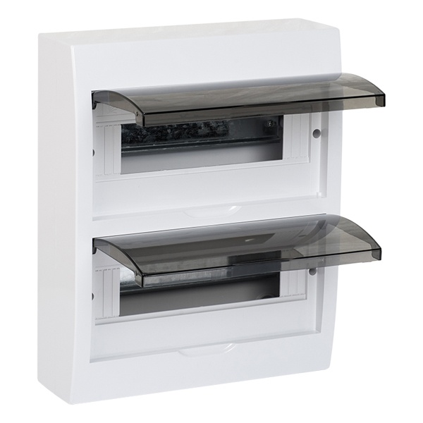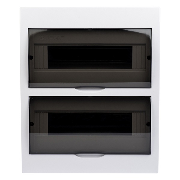Распределительный щит ЩРН от известной компании EKF представляет собой компактную конструкцию настенной установки, служащую оболочкой для сборки различного модульного оборудования, устройств управления, таймеров и УЗО. Сфера применения данного бокса разнообразна: от жилых и офисных помещений до производственных цехов, подвалов и промышленных секторов. Он состоит из каркаса и 2-х дверей, материалом изготовления которых служит прочный ABS-пластик, обеспечивающий надежную степень защиты IP41. Дверцы имеют прозрачный затемненный внешний вид и обеспечивают наглядность за работой встроенной аппаратуры. Они открываются вертикально вверх и позволяют размещать бокс на стене независимо от положения соседних стен. Внутреннее пространство оснащено 2 DIN-рейками, 4-мя шинами N/PE с 5 отверстиями для подключения нулевого и заземляющего проводника. Данная модель рассчитана на установку 24 модулей и вмещает 2 ряда по 12 единиц.