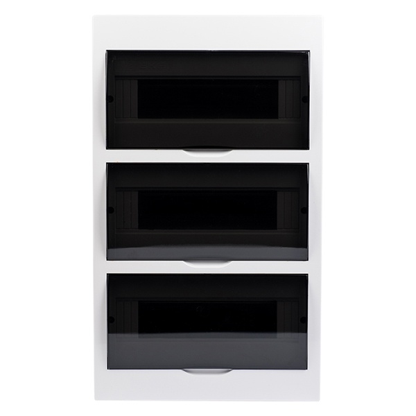 Особенностью щита является наличие 3 дверей, открывающихся вертикально вверх, что обеспечивает удобный монтаж независимо от положения соседних стен. Двери из пластика имеют затемненный прозрачный вид, который обеспечивает наглядность за работой аппаратуры. В комплект поставки входит 3 DIN-рейки, на которые производится монтаж устройств, а также 2 шины N/PE с 6 отверстиями и 2 шины с 7 отверстиями. Подключение кабеля осуществляется снизу сквозь выштампованные кабельные вводы. Распределительный щит обладает эргономичным дизайном, удобен и практичен в эксплуатации. Он неприхотлив в обслуживании, поэтому отлично подходит для размещения как в жилом, так и промышленном секторе.