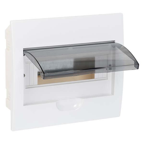 Необходимые параметры ниши: 210х265х65 мм. Особенностью щита является наличие дверцы, открывающейся вертикально вверх, что обеспечивает удобный монтаж независимо от положения соседних стен. Дверь из пластика имеет прозрачный вид с небольшой степенью тонирования, которая обеспечивает наблюдение за работой аппаратуры. В комплект поставки входит DIN-рейка, на которую производится монтаж устройств, а также 2 шины N/PE с 5 отверстиями для подключения нулевого и заземляющего проводника. Подвод кабеля осуществляется снизу сквозь выштампованные кабельные вводы. Распределительный шкаф встраиваемого типа удобен в эксплуатации и придает эстетичный вид, так как занимает минимум пространства. Он используется для размещения в жилых секторах, офисах и производственных цехах.