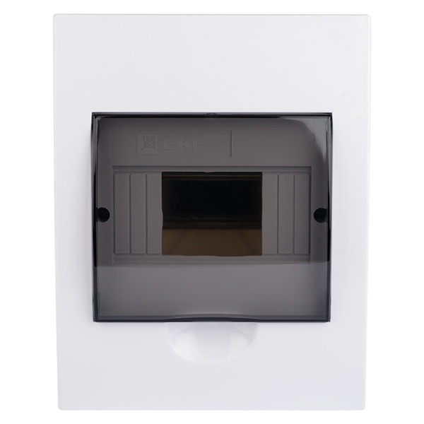 Распределительный щит ЩРВ от известной компании EKF представляет собой компактную конструкцию с установкой встраиваемого типа, которая служит оболочкой для сборки различного модульного оборудования, устройств управления, таймеров и УЗО. Сфера применения данного бокса разнообразна: от жилых и офисных помещений до производственных цехов, подвалов и промышленных секторов. Он состоит из каркаса и двери, материалом изготовления которых служит прочный ABS-пластик, обеспечивающий надежную степень защиты IP41. Дверца имеет прозрачный внешний вид с небольшой степенью затемнения, которая обеспечивает наблюдение за работой встроенной аппаратуры. Она открывается вертикально вверх и позволяет размещать бокс в углу помещения. Для монтажа корпуса необходимо заранее подготовленное углубление в стене со следующими размерами: 210х162х65 мм. Внутреннее пространство оснащено DIN-рейкой, 2-мя шинами с 3 отверстиями для подключения нулевого и заземляющего проводника. Данная модель рассчитана на установку 6 модулей.