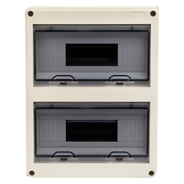 Распределительный бокс ЩРН от известной компании EKF представляет собой компактную конструкцию с установкой навесного типа, которая служит оболочкой для сборки различного модульного оборудования, устройств управления, таймеров и УЗО. Данная модель бокса относится к герметичной серии корпусов, поэтому сферой использования являются помещения с повышенным уровнем пыли и влаги, подвалы, гаражи и производственные цеха. Материалом корпуса и дверей служит прочный ABS-пластик, обеспечивающий надежную степень защиты IP65. Корпус имеет светло-серый оттенок под номером RAL 7035, а 2 дверцы в дымчатом варианте обеспечивают наблюдение за работой встроенной аппаратуры. Они открываются вертикально вверх и позволяют размещать распределительный щит в углу помещения. Внутреннее пространство оснащено 2 DIN-рейками, а также 4-мя медными шинами N и PE с 6-ю отверстиями для подключения нулевого и заземляющего проводника. Навесной шкаф рассчитан на установку 24 модулей: 2 ряда по 12 единиц с номинальной величиной тока до 125 Ампер.