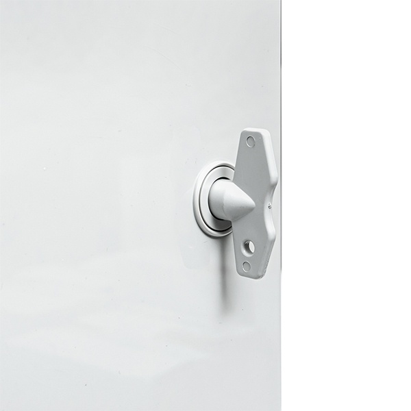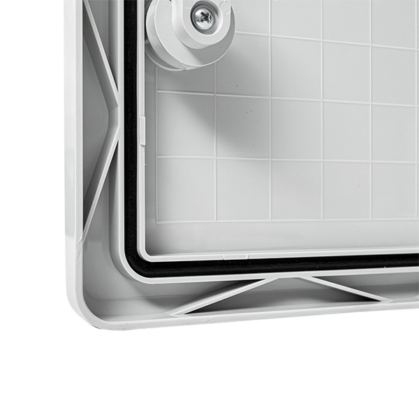 Особенностью модели является наличие сплошной двери с пылевлагозащищенным замком, которая крепится на петлях, а по внутреннему периметру имеется герметичный уплотнитель. Скошенный желоб не допускает попадания влаги и грязи внутрь корпуса.