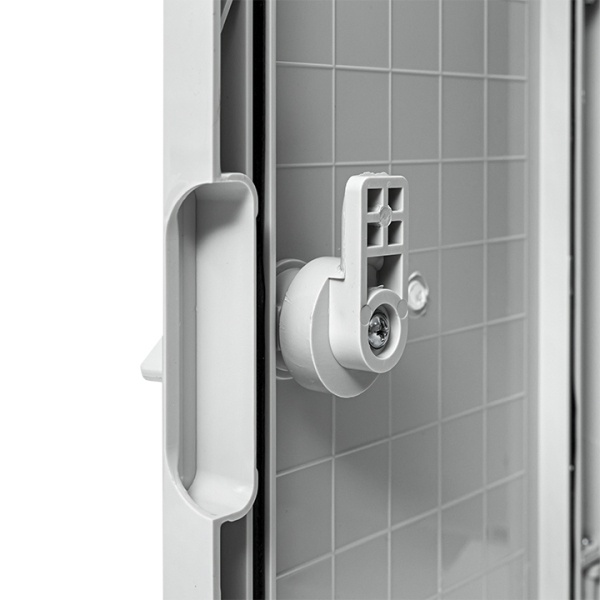 Особенностью модели является наличие сплошной двери с пылевлагозащищенным замком, которая крепится на петлях, а по внутреннему периметру имеется герметичный уплотнитель. Скошенный желоб не допускает попадания влаги и грязи внутрь корпуса.