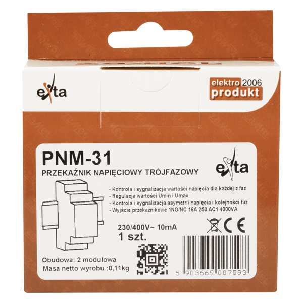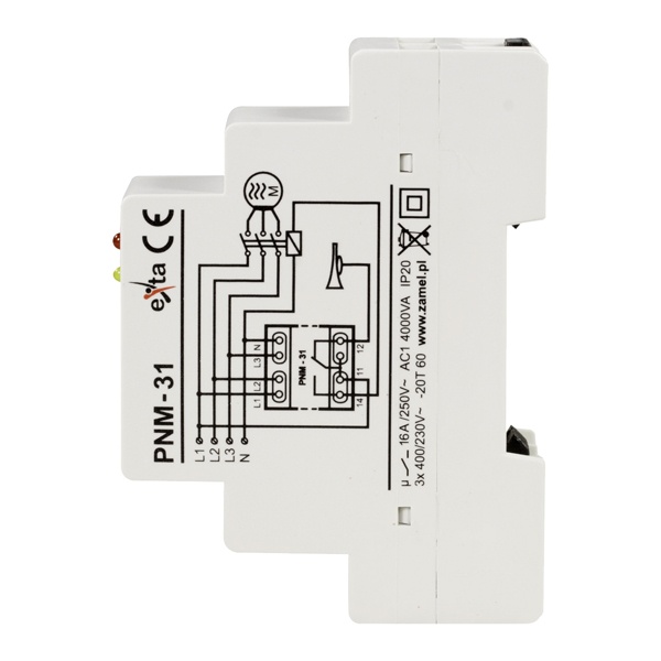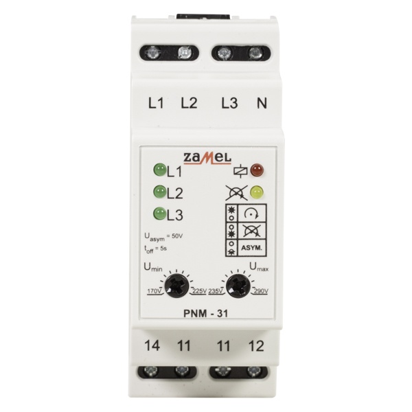 Реле напряжения PNM-31 служит для контроля значения напряжения в трехфазной сети с целью защиты приемного устройства от роста или падения напряжения свыше установленных минимальных максимальных значений. Реле работает в режиме постоянного замедленного выключения (около 5 сек.). Устройство также обнаруживает неправильную очередность фаз асимметрию напряжения.