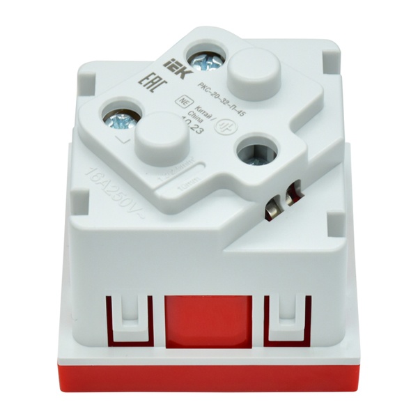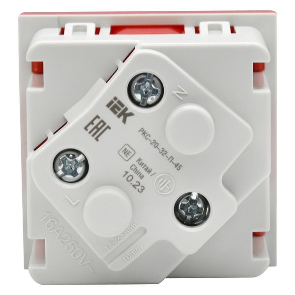 Розетка предназначена для подключения электрических приборов переменного тока с напряжением до 250 В, частотой 50 Гц и номинальным током 16 А. Розетка оснащена защитными шторками и заземляющими контактами. Для подключения проводников используются винтовые зажимы на задней части розетки.