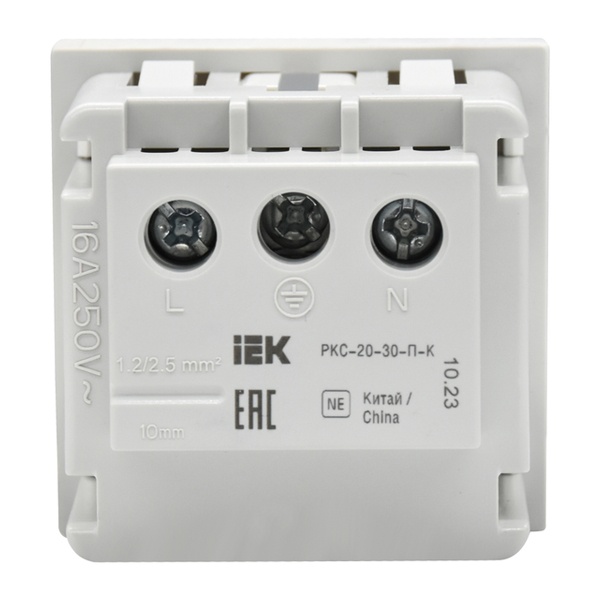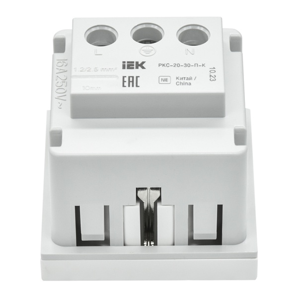 Розетка предназначена для подключения электрических приборов переменного тока с напряжением до 250 В, частотой 50 Гц и номинальным током 16 А. Розетка оснащена защитными шторками и заземляющими контактами. Для подключения проводников используются винтовые зажимы на задней части розетки.