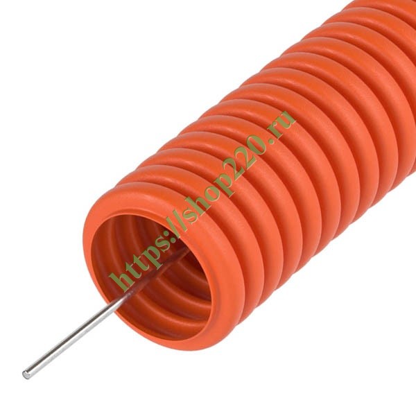 Труба гофрированного типа торговой компании Промрукав представляет собой изделие оранжевого цвета RAL 2004, которое относится к тяжелой серии и не распространяет горение. Оно соответствует требованиям пожарной безопасности и используется в огнестойких кабельных линиях. Также областью применения такого шланга выступают: прокладка слаботочных и силовых электросетей, эксплуатируемых при напряжении переменного тока величиной до 2000 Вольт, прокладка компьютерных, телевизионных, телефонных и IT-сетей. Внешний диаметр изделия 16 мм а внутренний 10,7 мм. Длина в бухте равна 100 м и обеспечивает минимальное количество стыков. Сопротивление сжатия соответствует 750 Н. Тяжелая гофротруба обладает повышенной прочностью и допускает заливку бетоном с использованием вибрационных установок. Она оснащается зондом из стальной проволоки для удобства протяжки электропровода. Материалом изготовления выступает ПНД – полиэтилен низкого давления. Среди достоинств гофрированной трубы выделяют высокую степень защиты от пыли и влаги IP66, коррозионную и химическую стойкость, а также морозостойкость до -55 градусов Цельсия без изменения своих физико-механических характеристик.