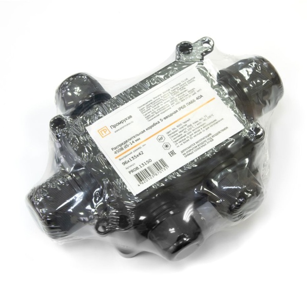 PR08.13150 Распределительная коробка Промрукав 5-вводная IP68 ПА66 40А 450В d5-14 мм 135х96х42 черная