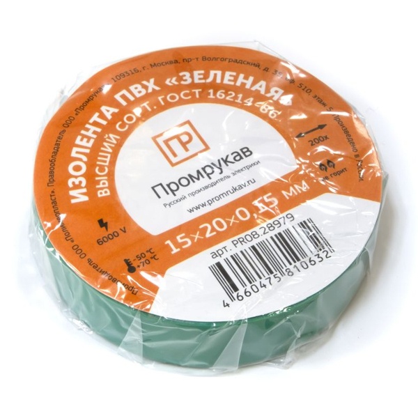 PR08.28781 Изолента ПВХ Промрукав зеленая 0,15 x 15 мм х 20 м (10 шт/уп)