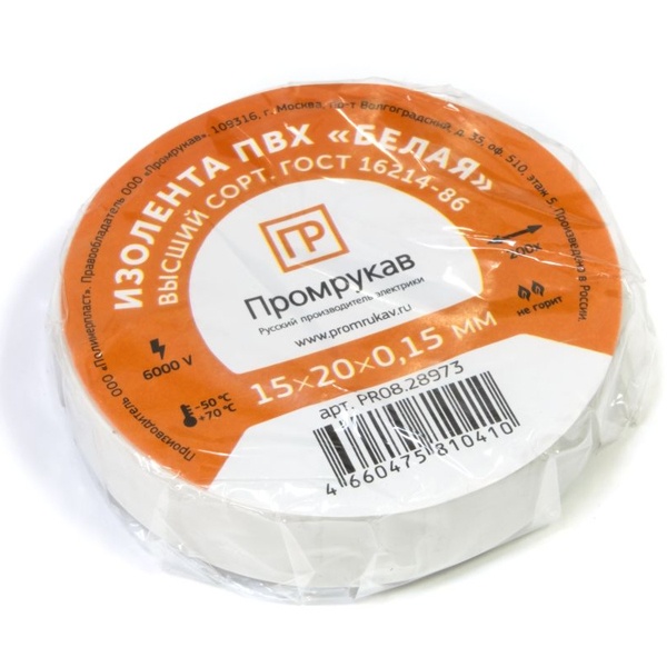 PR08.28782 Изолента ПВХ Промрукав белая 0,15 x 15 мм х 20 м (10 шт/уп)