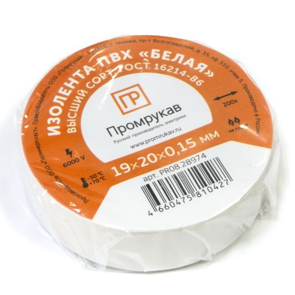 Изоляционная ПВХ лента ширина 19мм длина 20м, цвет белый, Промрукав PR08.28784