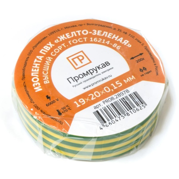 Изоляционная ПВХ лента ширина 19мм длина 20м, цвет желто-зеленый, Промрукав PR08.28786