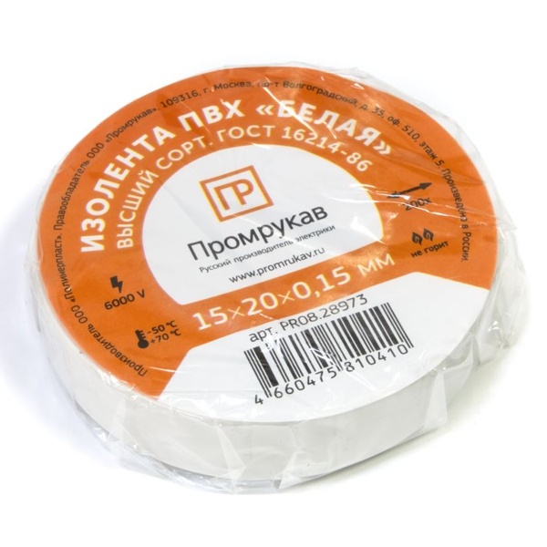 PR08.28973 Изолента ПВХ Промрукав белая 0,15 x 15 мм х 20 м