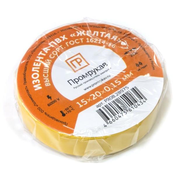 PR08.28975 Изолента ПВХ Промрукав желтая 0,15 x 15 мм х 20 м