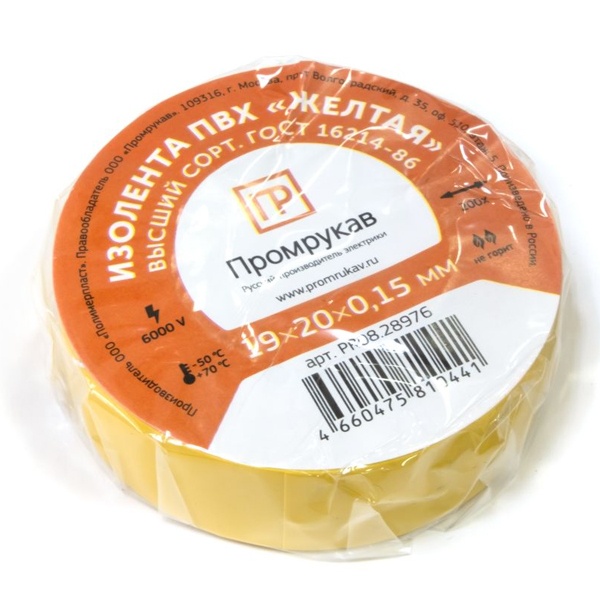PR08.28976 Изолента ПВХ Промрукав желтая 0,15 x 19 мм х 20 м