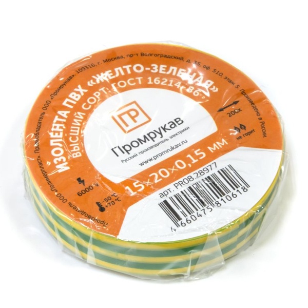 Изоляционная ПВХ лента ширина 15мм длина 20м, цвет желто-зеленый, Промрукав PR08.28977