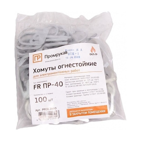 Для надежной фиксации кабелей и проводов в кабельном канале используется специальный крепеж в виде хомута. Данная модель ПР-40 из серии FR ПР отечественного производителя Промрукав имеет различное применение. Это неотъемлемый элемент при прокладке огнестойких кабельных линий. Использование такого фиксирующего крепежа допустимо при любых условиях окружающей среды, как внутри, так и снаружи зданий, поэтому материалом его изготовления выступает оцинкованная сталь, которая защищает металл от коррозии и обеспечивает длительный срок эксплуатации. Хомут выполнен в виде тонкой пластины, которая приобретает закругленную форму при обхватывании кабельной линии. Максимальный диаметр охвата составляет 18 мм. Площадь сечения охвата соответствует 255 мм2. При этом такой хомут допускает крепление нескольких кабелей одновременно. Его фиксация в кабель-канале производится с помощью винта, сверху прокладывается кабель и надежно закрепляется с двух сторон с помощью скоб. Упаковка включает в себя 100 штук.
