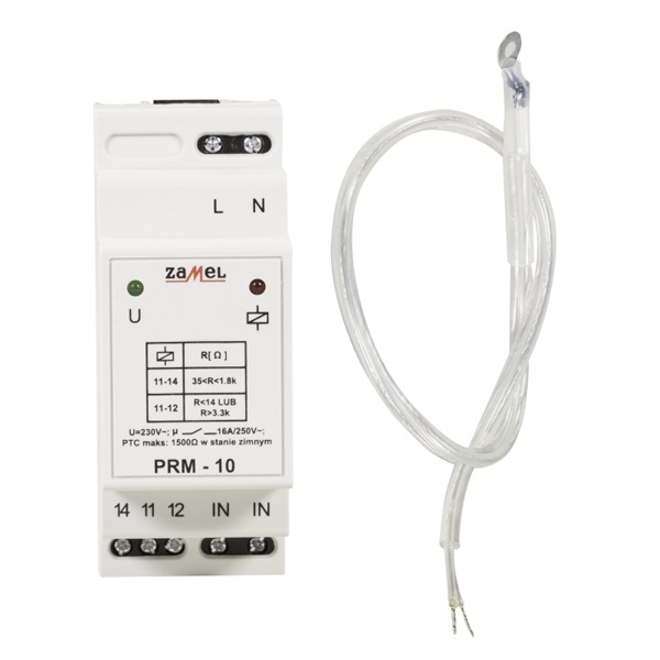 Реле контроля температуры PRM-10 предназначено для защиты электрических устройств (напр., двигателей) от опасного роста температуры. Измерение температуры производиться через внешные датчики температуры PTC, которые возможно соеденять поочередно. Сильное повышение температуры включает исходное реле. PTC гальванически отизолирован от сети внутренним разделяемым трансформатором.