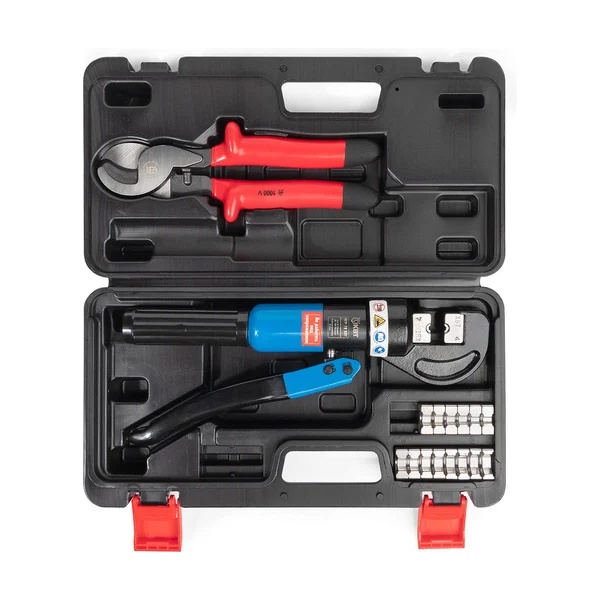 Пресс гидравлический ручной – это профессиональный инструмент для опрессовки кабельных наконечников и резки болтов. Он предназначен для работы с наконечниками сечением до 70 мм2, что позволяет использовать его для работы с крупными и средними сечениями проводов. В комплект входят кабельные кусачки для резки проводников диаметром до 16 мм.