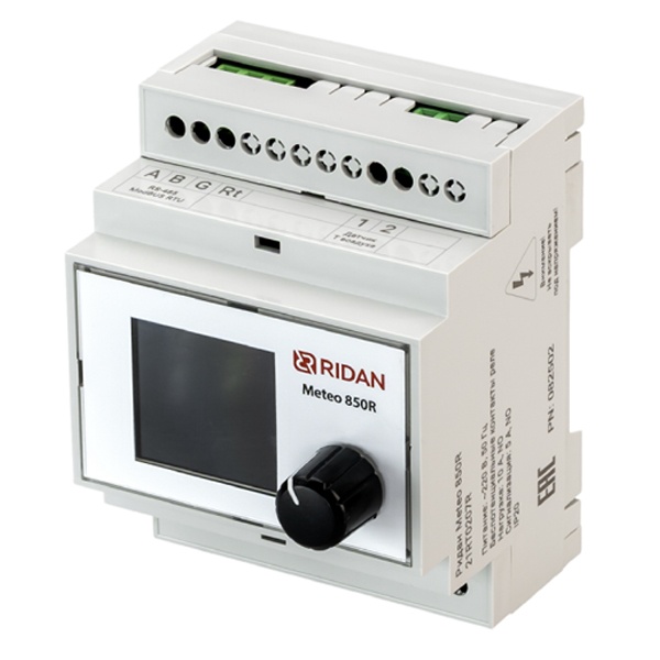 Ридан Meteo 850R — программируемая метеостанция, предназначена для управления кабельными системами снеготаяния, установленными на кровле. Позволяет контролировать температуру окружающей среды и наличие атмосферных осадков, включать систему кабельного обогрева в автоматическом режиме. Система Ридан Meteo 850R состоит из терморегулятора с датчиком температуры воздуха в комплекте и датчика кровли Ридан Roof 850R. Устанавливается на профиль DIN.