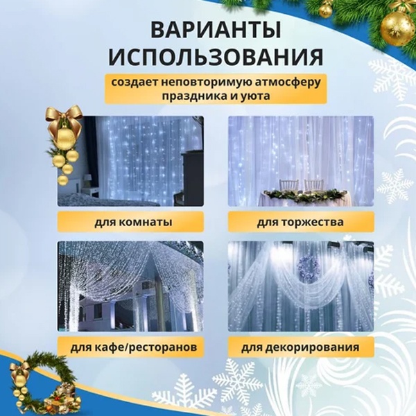 Гирлянда «Светодиодный дождь из росы» — это эффектное украшение для создания праздничной атмосферы. Она представляет собой множество тонких нитей с крошечными светодиодами в форме капелек росы. Гирлянду легко закрепить на шторах, тюли или карнизе с помощью удобных пластиковых крючков. В комплект входит пульт дистанционного управления, с которым можно выбрать один из 8 режимов свечения. Такое украшение наполняет пространство теплом и уютом, идеально подходит для декора интерьера, оформления праздников, вечеринок, садовых зон, кафе, баров и ресторанов.