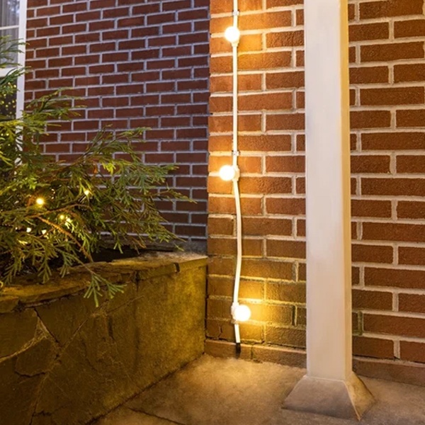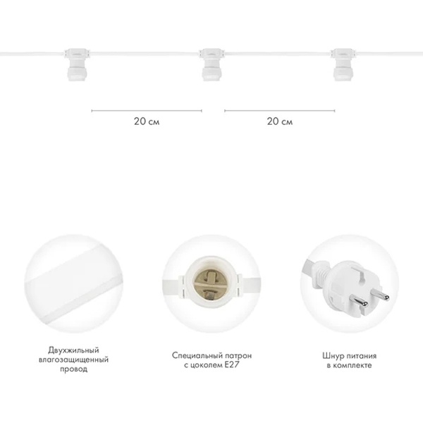 Гирлянды «Белт Лайт» могут быть двух типов – двужильные и пятижильные. Пятижильные имеют 2 модификации: для уличного применения с высоким уровнем влагозащиты и без специальной защиты для помещений. Двужильный «Белт Лайт» имеет только влагозащищенное исполнение. Для не влагозащищенного пятижильного провода Белт Лайт сделано исключение: на нем специальные патроны, имеющие цоколь E27 с «ножевыми» контактами, которые могут быть установлены в любом месте. Двужильные гирлянды имеют только режим непрерывного свечения, их подключают прямо к сети 220V. В отличие от них, пятижильные системы «Белт Лайт» питаются через контроллер. Они могут работать в светодинамическом режиме с использованием различных световых эффектов, например, «бегущий огонь». Традиционно гирлянды «Белт Лайт» оснащаются небольшими лампами накаливания. Но в настоящее время они уступают место разноцветным светодиодным лампам. На стороне последних огромные преимущества: маленькие размеры, увеличенный до 100 000 часов ресурс, хорошая влагозащищенность, широкий диапазон рабочих температур. Они обладают недосягаемой для ламп накаливания насыщенностью цветов и яркостью свечения, невысокой потребляемой мощностью (менее 5 Вт). Гирлянду можно разрезать, а фрагменты собирать в электрическую цепь и подключать через контроллер или напрямую по соответствующей схеме. Гирлянда «Белт Лайт» прекрасно подходит для декорирования любых архитектурных сооружений или для создания «перетяжек» между опорами освещения или деревьями.Данная гирлянда имеет 2 жилы. Расстояние между патронами 20 см.