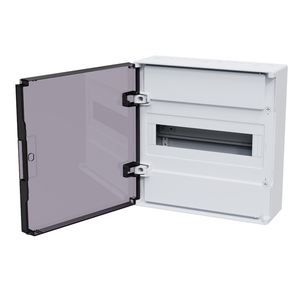 Накладной пластиковый однорядный распределительный шкаф 12 модулей с черной дверью 379788