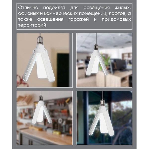 Светодиодная лампа-трансформер — современное решение для освещения жилых, офисных и коммерческих помещений, лофтов, гаражей и придомовых территорий. Устройство излучает яркий холодный белый свет, визуально расширяющий пространство и создающий атмосферу чистоты и свежести. Простота монтажа, высокая энергоэффективность, надёжная конструкция и стильный дизайн делают лампу идеальным выбором для тех, кто ценит комфорт и функциональность. Благодаря трансформируемой форме вы можете изменять направление света по своему усмотрению, создавая оптимальное освещение в любой ситуации.