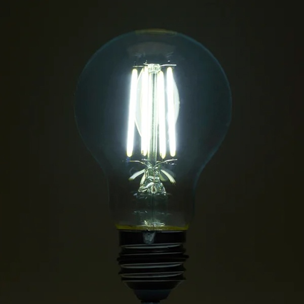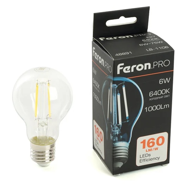 Филаментная лампочка Ферон с нитевидными светодиодами, мощностью 6 Ватт, с цоколем E27, холодный дневной свет, прозрачная колба 48891